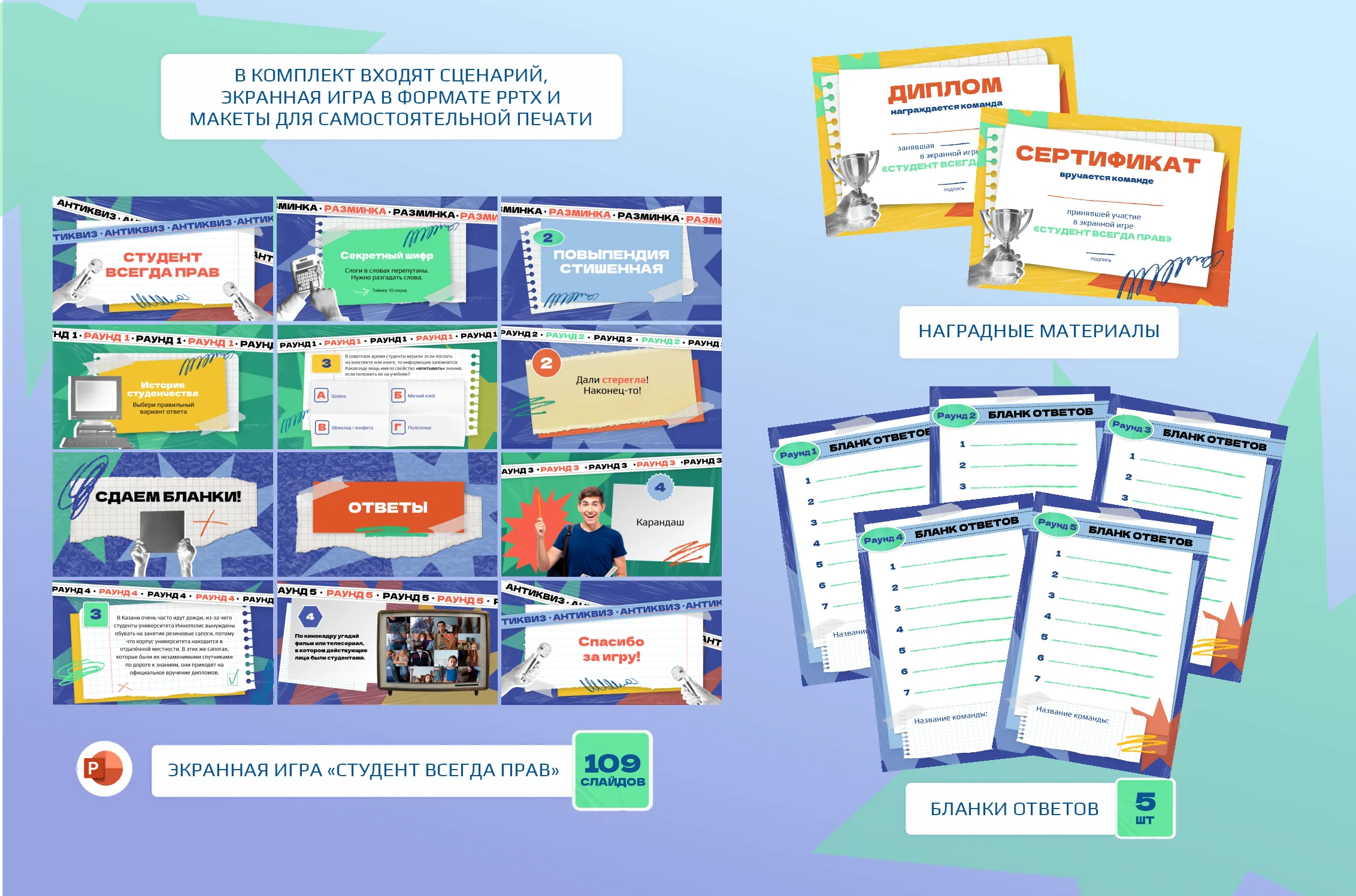 Реквизит: экран с проектором, бланки для ответов, дипломы и наградная продукция для команд.
