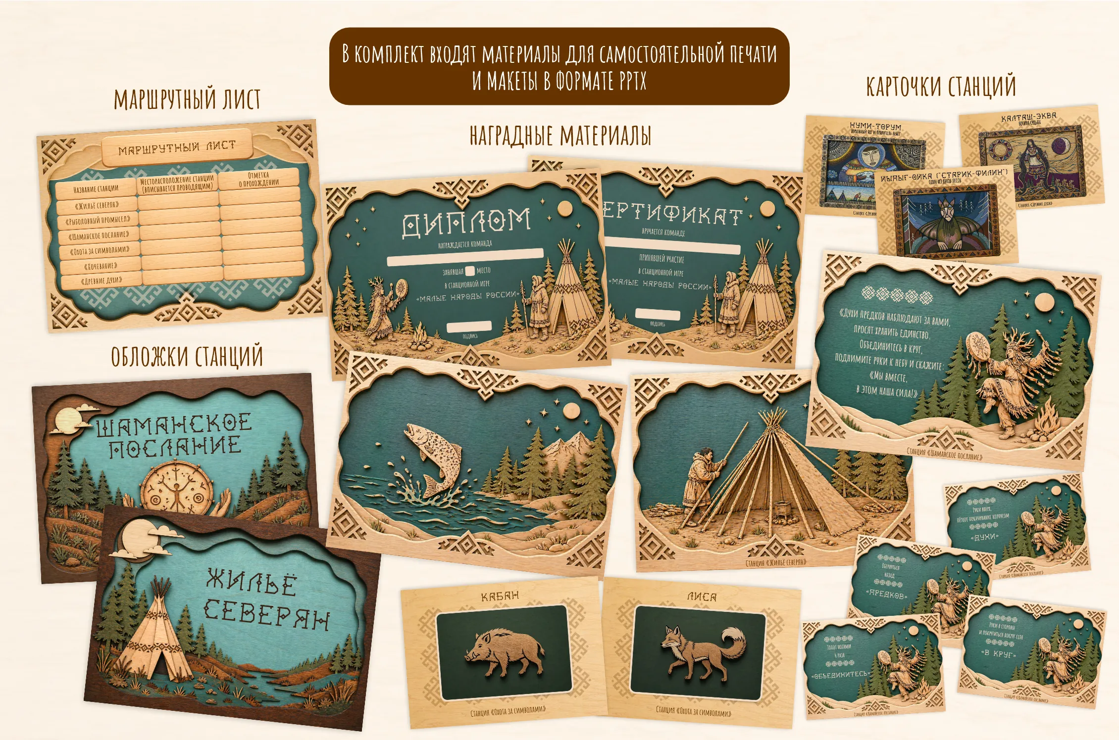 Слова учителя: Здравствуйте дети! Наше мероприятие приурочено ко Дню коренных малочисленных народов Российской Федерации. Сегодня вы узнаете о традициях, обычаях и образе жизни народов с многих уголков нашей страны, начиная с Вепсов, проживающих на северо-западе, и заканчивая Нанайцами с Дальнего востока. Для полного погружения мы подготовили несколько станций, где вы сможете почувствовать на себе, какого жилось или до сих пор живётся представителям этих народов. Просим капитанов команд подойти и получить маршрутные листы.