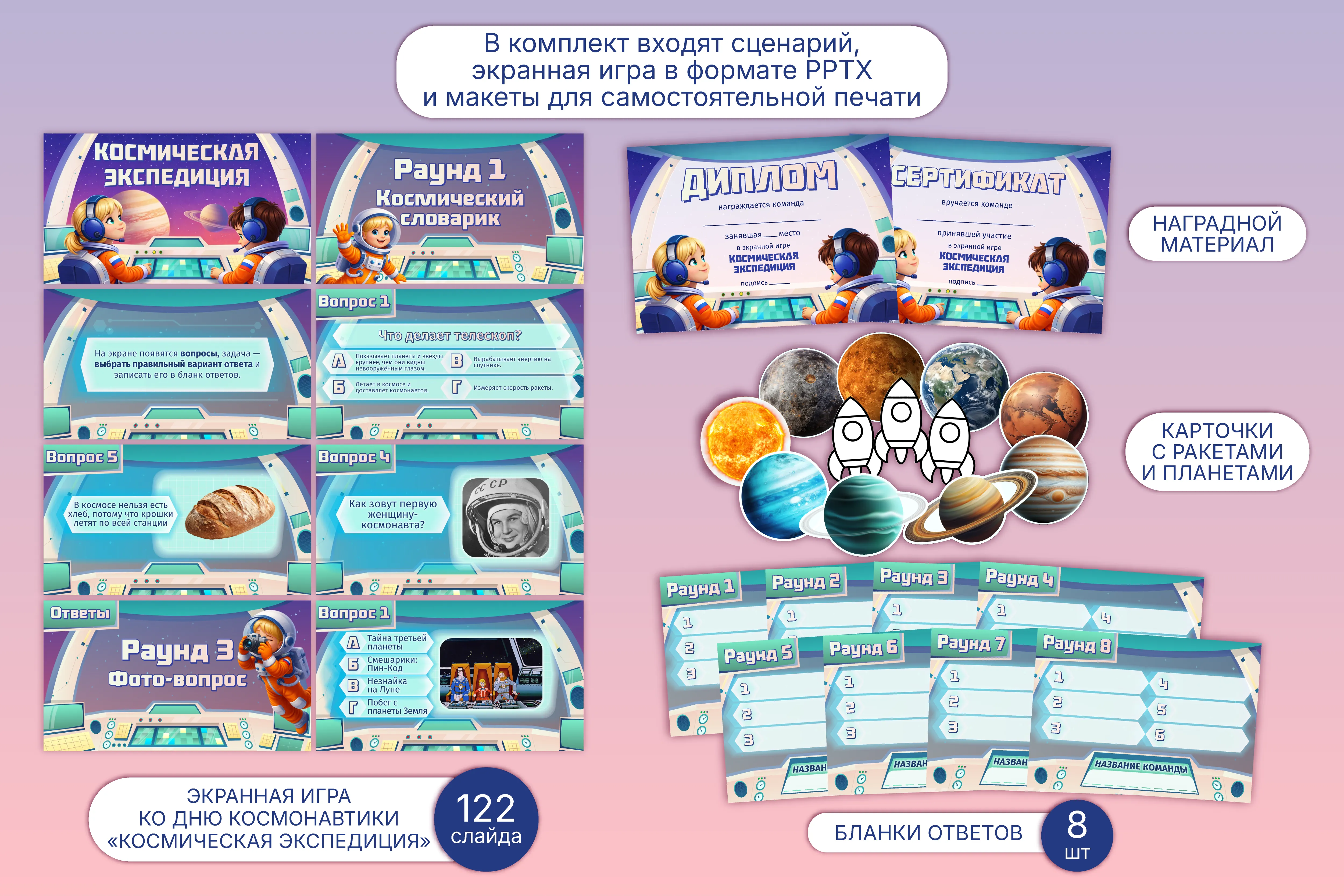 Слова учителя: Приветствую Вас, бравые космонавты. Сегодня мы празднуем день космонавтики – праздник тех, кто не боится покидать родную планету и исследовать безграничные просторы вселенной. Я вижу, что вы, юные исследователи, тоже хотите принять участие в изучении просторов Солнечной системы, и с радостью стану проводником на вашем пути. Но для начала нам нужно разделиться на экипажи, ведь одна ракета не вместит вас всех. В одном экипаже может быть от 4 до 6 человек.