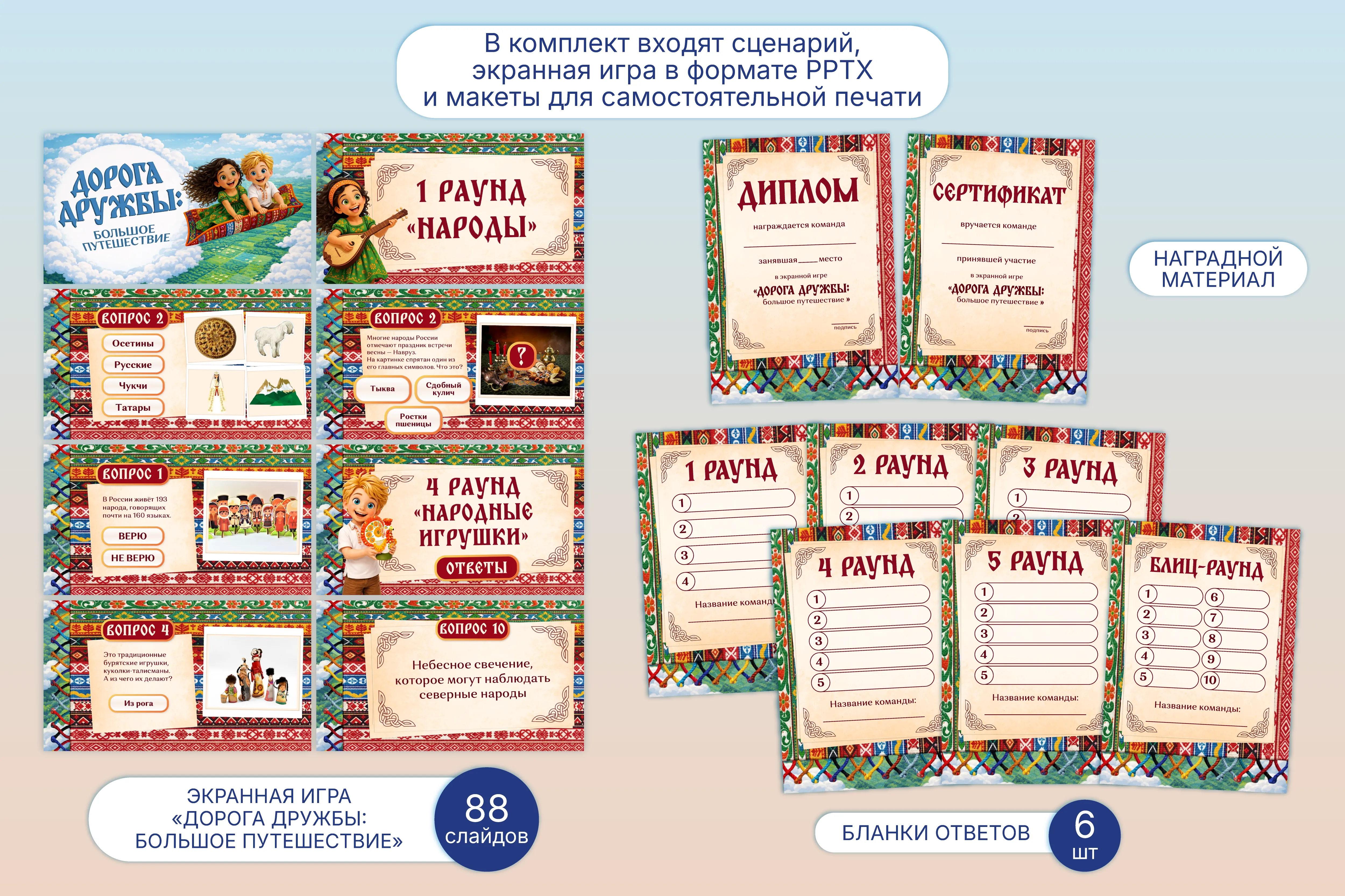 Если подняться над землёй на сказочном ковре-самолёте, то с высоты наша Родина, с её многочисленными народами и культурами, будет выглядеть как красочное лоскутное одеяло. Давайте же вместе отправимся в большое интеллектуальное путешествие по удивительному миру народов России.