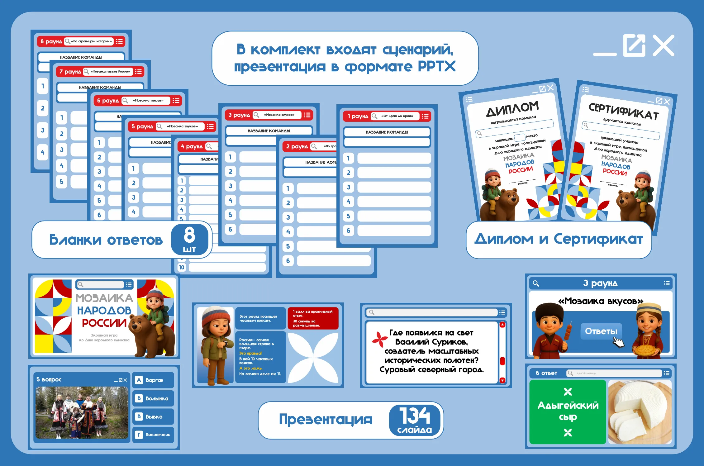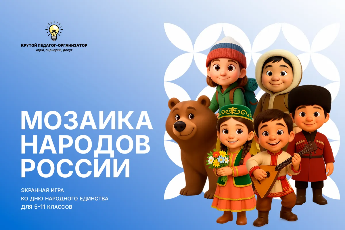 Ведущий: Здравствуйте, дорогие друзья! Сегодня мы собрались здесь, чтобы отметить особенный праздник – День народного единства. Мы предлагаем вам погрузиться в увлекательное путешествие по многонациональной и многогранной культуре нашей страны с помощью квиза "Мозаика народов России". Наша страна – самая большая в мире, в ней проживает более 200 народов, со своими языками, традициями, религией. Знакомиться с ними – это не только расширять свой кругозор, но и проявлять уважение.
