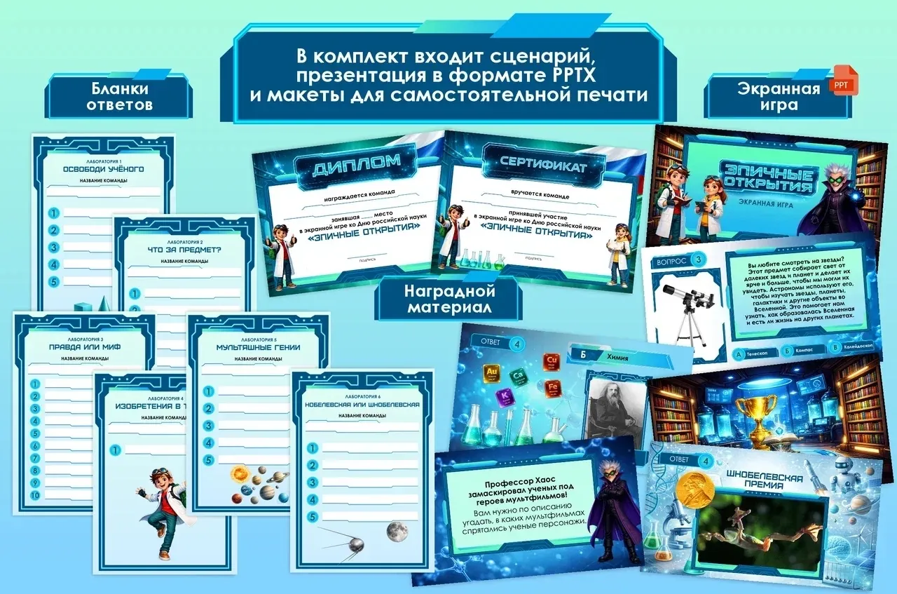 Ведущий: Ребята, сегодня мы спасаем великих ученых! Профессор Хаос заточил их на картинках, и чтобы освободить каждого, вам нужно внимательно послушать описание, посмотреть на фон, понять, какой наукой занимался этот ученый, и записать верный вариант в бланк ответов.