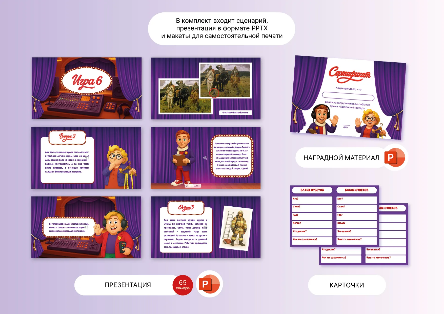 Учитель: Здравствуйте, мои юные друзья! Проходите, устраивайтесь поудобнее. Сегодня нас с вами ждет самое настоящее приключение. Я ненадолго стану для вас не просто учителем, а директором волшебного театра. Что же там, за тяжелым бархатным занавесом? Оказывается, целый мир! Мир, где рождаются спектакли. Но чтобы чудеса представлений работали, нужны самые разные мастера. Писатель, который сочиняет историю. Художник, который рисует мир. Костюмер, который одевает героев. Актеры, которые оживляют их. И еще десятки людей, чью работу мы не видим, но без нее на сцене была бы тишина и пустота. Сегодня вам выпадет удивительная возможность – окунуться в работу разных профессионалов. Наш театр как раз готовится к скорому представлению, а вы поможете в подготовке нашим театральным мастерам. Готовы постараться? Тогда не будем терять ни минуты! Наше путешествие начинается прямо сейчас. Вперед, к приключениям!