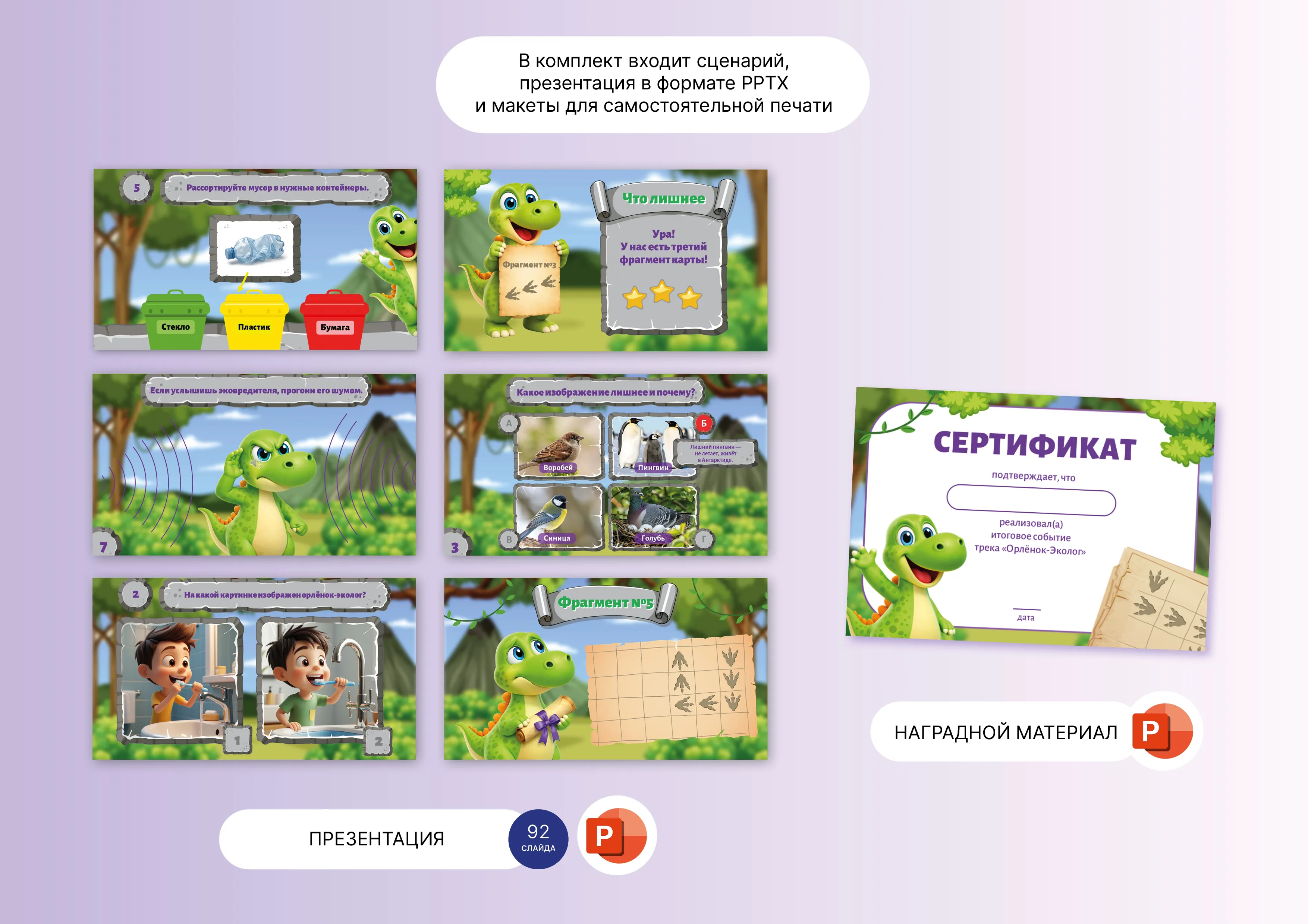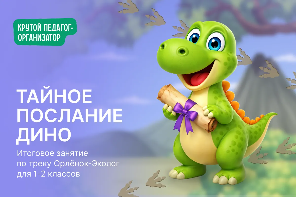 Ведущий: Ребята! Сегодня к нам за помощью обратился необычный друг — динозаврик Дино. Он живёт в далёком прошлом, но очень хочет, чтобы будущее нашей планеты было чистым и счастливым. Дино нашёл древнее послание, но оно зашифровано. Чтобы расшифровать его, нам нужно собрать 6 частей шифровальной карты. Вы готовы стать командой Орлят-спасателей и помочь Дино? Тогда в путь!