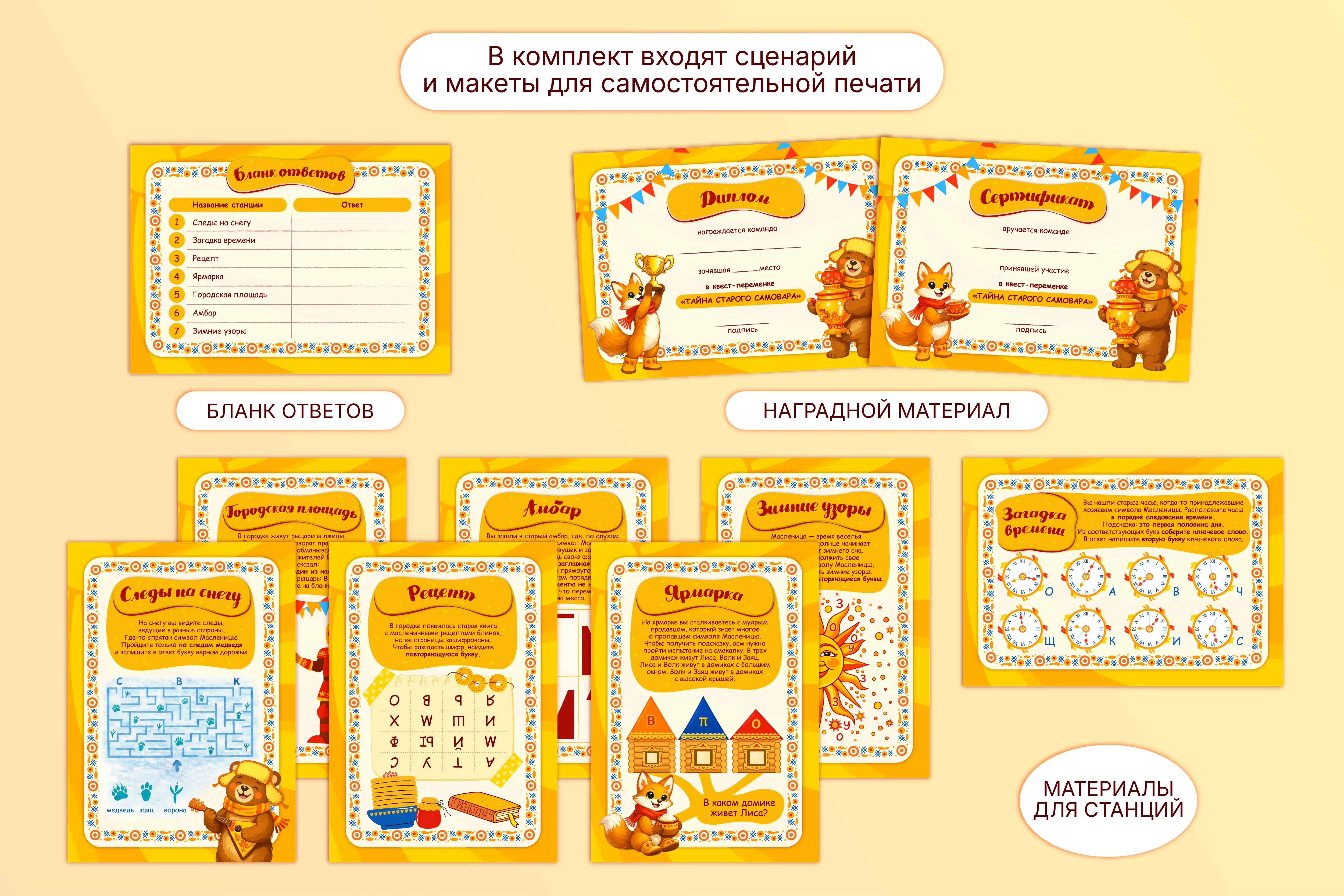 Организационный момент: ведущий рассказывает легенду о самоваре – символе Масленицы, объясняет правила прохождения на общей линейке. Задача участников – найти символ Масленицы. По школе развешаны задания, дети получают бланк ответов, их задача – найти все задания и ответить на них за несколько перемен в течение учебного дня. Затем принести бланк ведущему. Команда, набравшая наибольшее количество баллов, выигрывает. При равенстве баллов учитывается скорость прохождения.