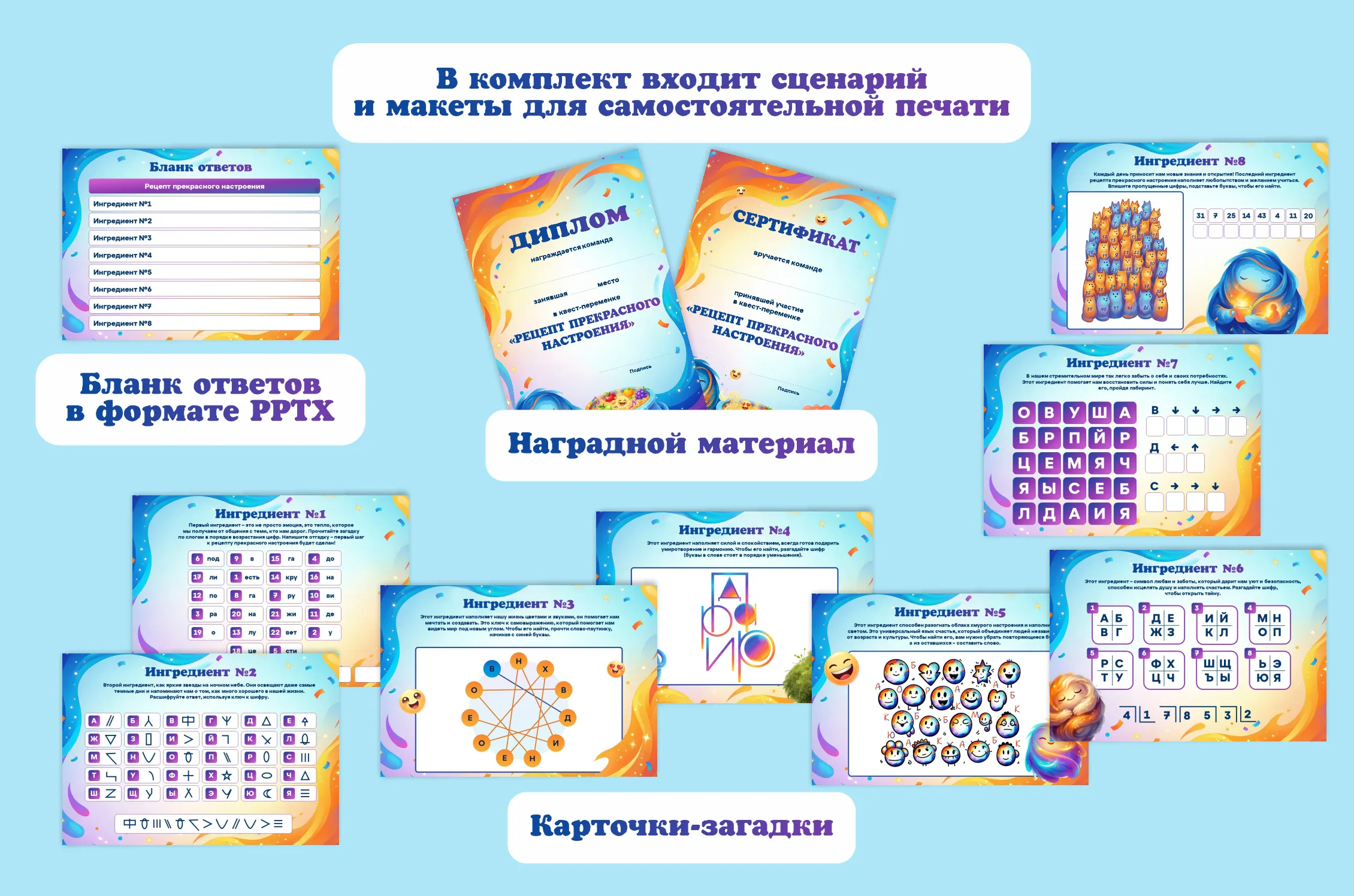 Организационный момент: Ведущий рассказывает легенду о потерянном рецепте прекрасного настроения, объясняет правила прохождения на общей линейке. Задача участников – восстановить рецепт, написать ингредиенты. По школе развешаны задания, дети получают бланк ответов, их задача – найти все задания и ответить на них за большую перемену (20 минут). Затем принести бланк ведущему. Команда/участник, набравшая наибольшее количество баллов, выигрывает. При равенстве баллов учитывается скорость прохождения.