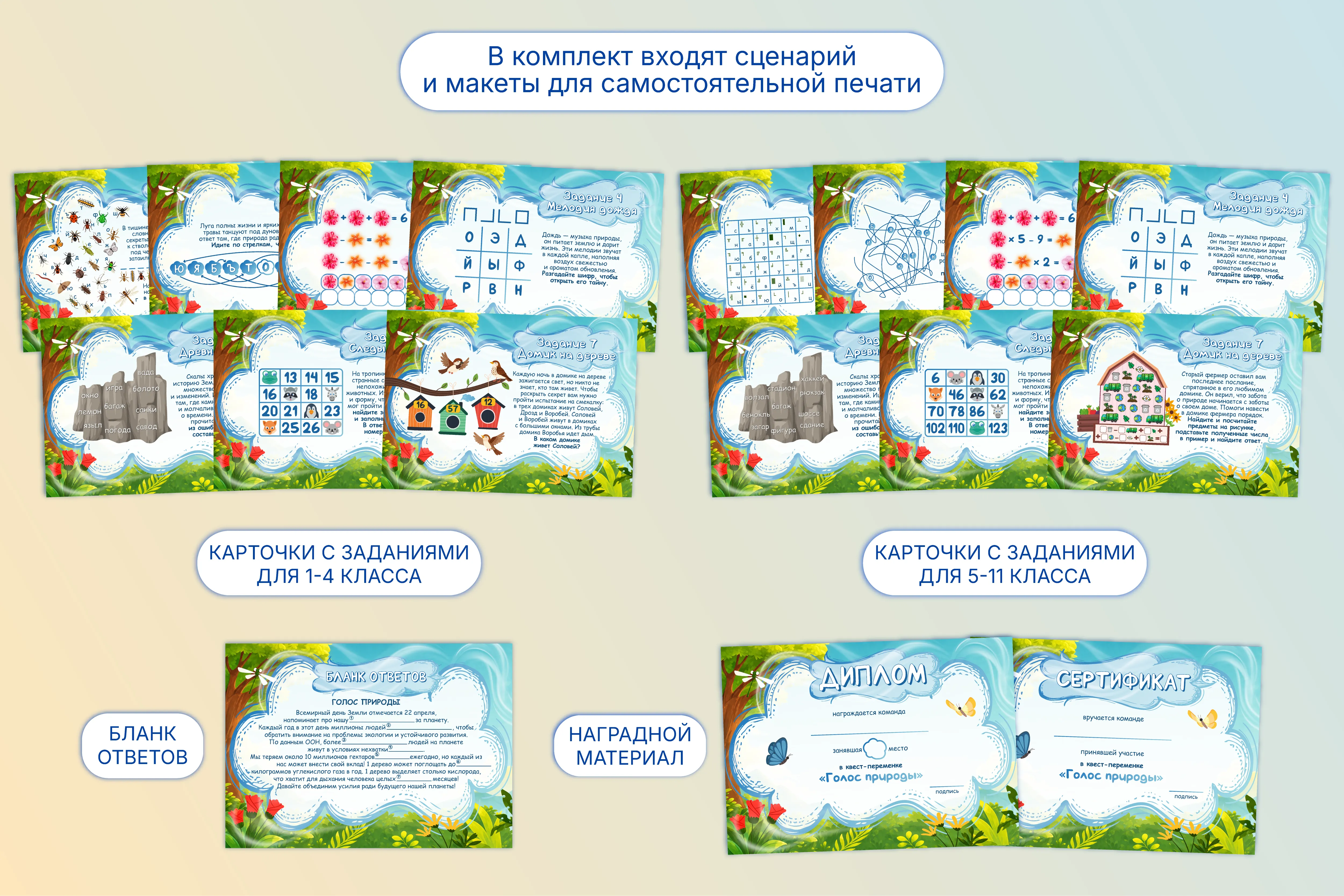 Организационный момент: ведущий рассказывает легенду о голосе природы, который на протяжении веков наблюдает за всеми живыми существами. Объясняются правила прохождения на общей линейке. Задача участников: разгадать все загадки, чтобы услышать голос природы. По школе развешаны задания, дети получают бланк ответов, их задача – найти все задания и ответить на них за несколько перемен в течение учебного дня. Затем принести бланк ведущему. Команда, набравшая наибольшее количество баллов, выигрывает. При равенстве баллов учитывается скорость прохождения.