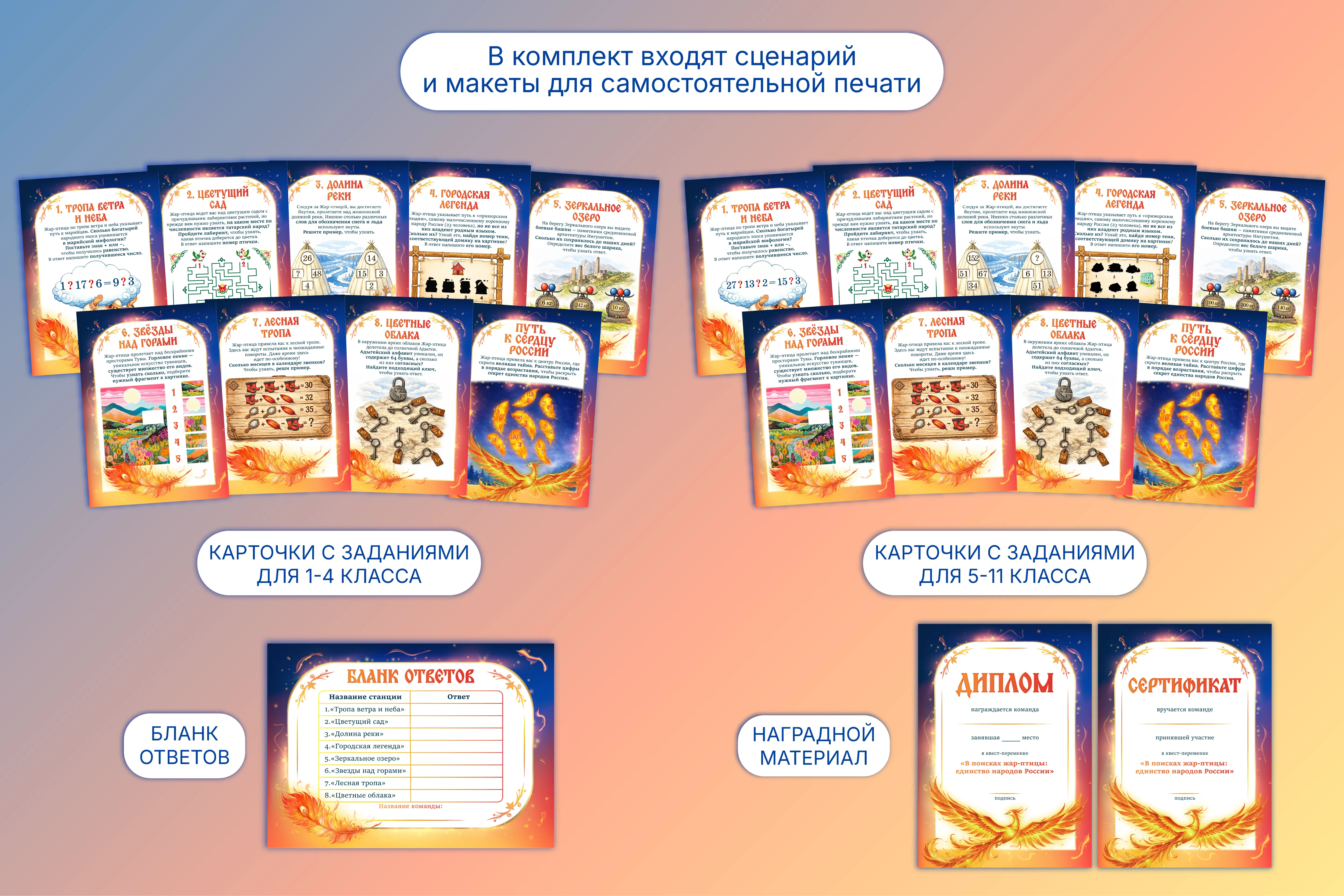 В сердце России, среди бескрайних лесов, гор и рек, живут народы с уникальными культурами, языками и традициями. Каждый из них хранит в себе удивительные истории и секреты, которые передаются из поколения в поколение. Но что объединяет эти многообразные народы? Какова тайна их единства? Вы – отважные искатели приключений, готовые отправиться в увлекательное путешествие по просторам России. Ваша цель: следуя за загадочной жар-птицей, собрать уникальные факты о народах, которые населяют эту страну. Каждое открытие станет ключом к разгадке великой тайны единства, связывающего разные культуры и обычаи.