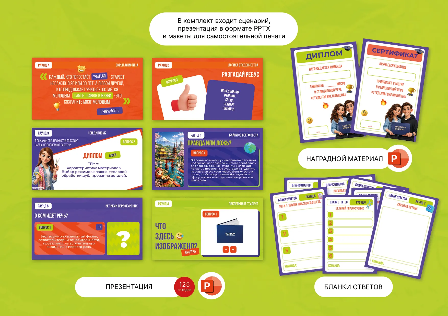 Ведущий: Возвращаемся к нашей первой фразе. Сегодня мы проверим не просто умение читать, а умение додумывать, достраивать и разгадывать. Умение находить связи там, где их, кажется, нет. Правила просты: уважение, азарт и честная игра. Жюри ведёт счёт, вы выкладываетесь по полной. Вас ждёт семь разных раундов. И каждый особенный: от проверки эрудиции до задач на скорость и расшифровку. Все ваши ответы, кроме самого финального раунда, вы будете записывать на специальных бланках (показывает бланк). После каждого вопроса или раунда – время на обсуждение, затем вы пишете окончательный вариант и сдаёте бланк нашему жюри по моей команде. Так что держите ручки наготове! Победит самая быстрая, дружная и смекалистая команда! Докажите, что вы действительно студенты вне шаблона! И если все готовы, мы будем начинать! Первый раунд «Байки со всего света».