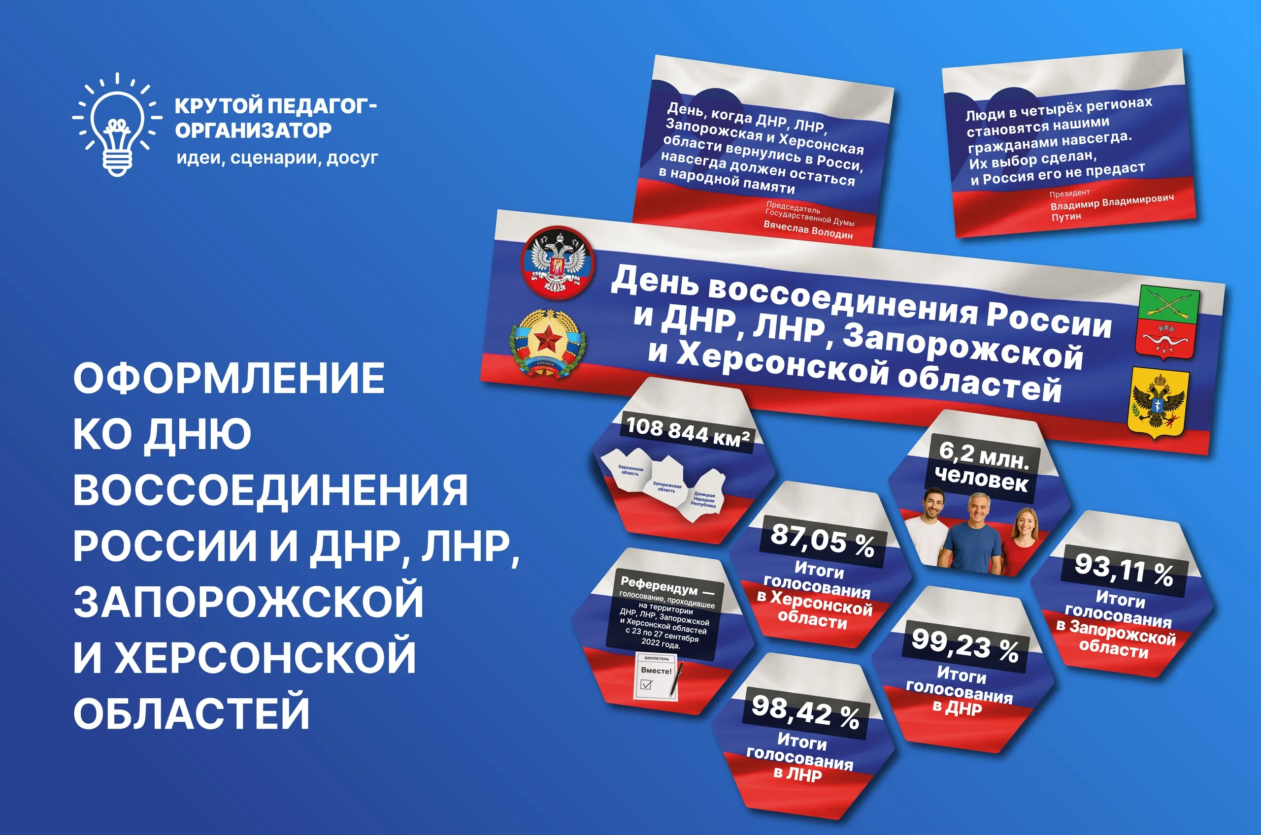 Оформление ко Дню воссоединения России и Донецкой Народной Республики, Луганской Народной Республики, Запорожской и Херсонской областей — авторская разработка дизайнеров «Крутого педагога-организатора»!