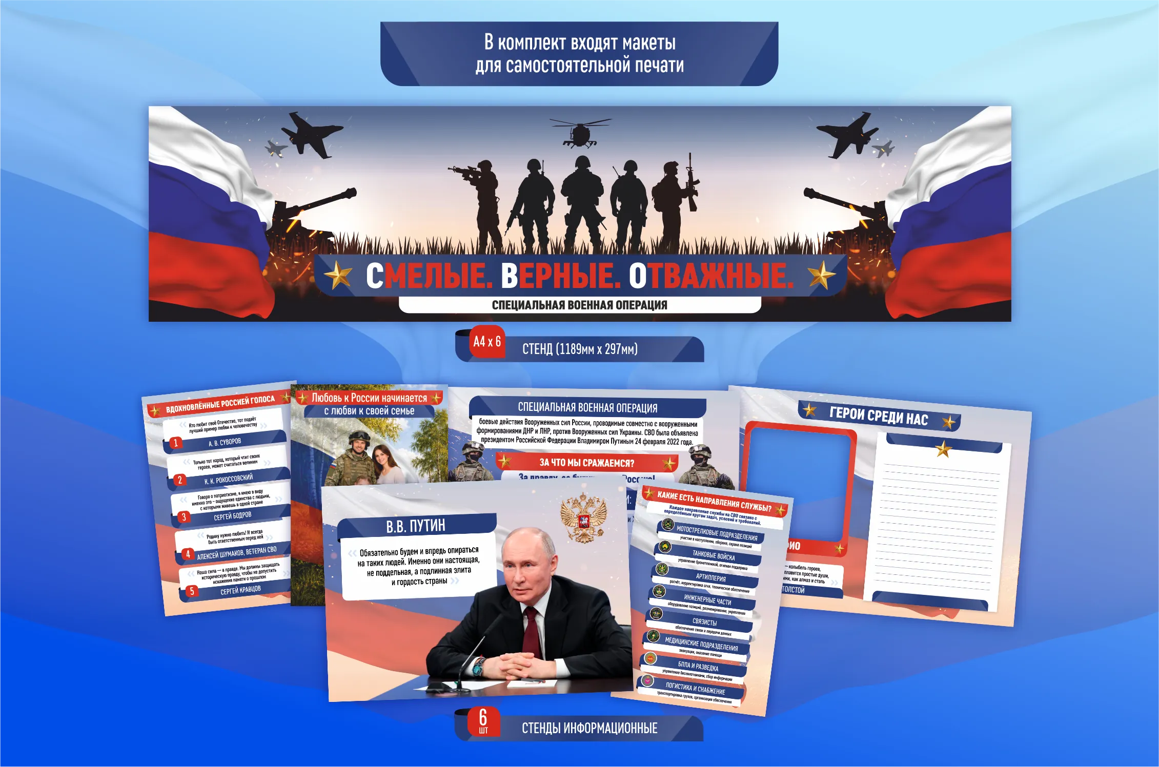 ▫ Центральная композиция — силуэты защитников с акцентом на слова «Смелые. Верные. Отважные.», где каждая буква С, В и О несёт смысл.