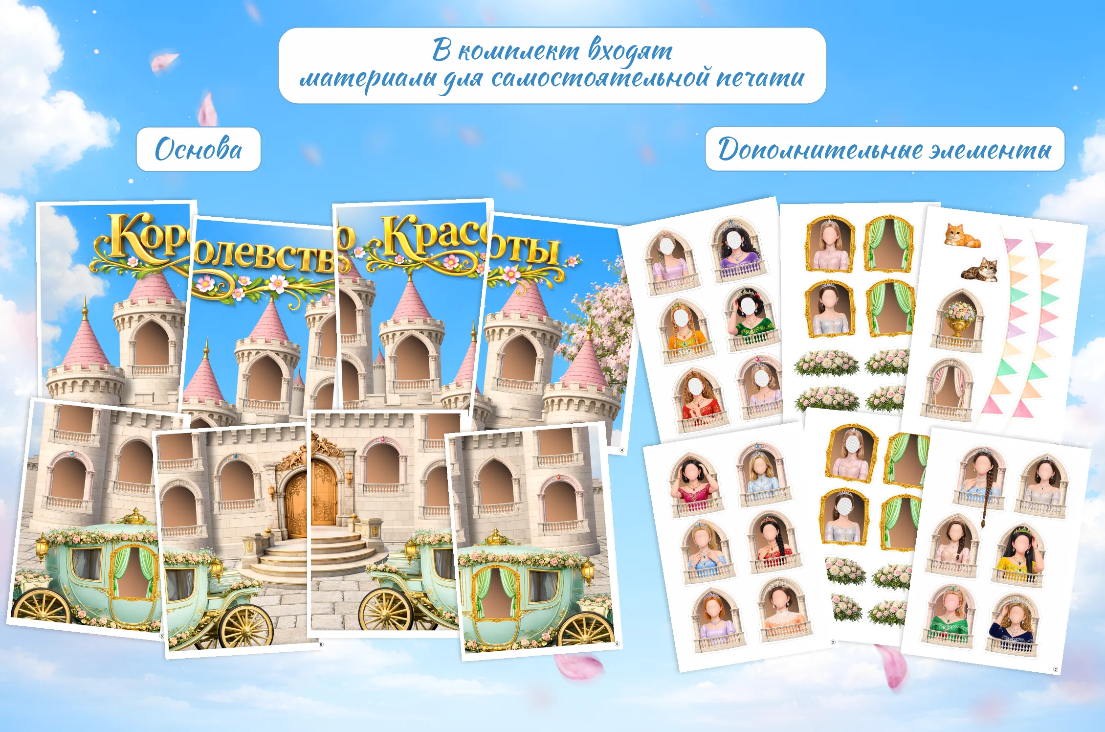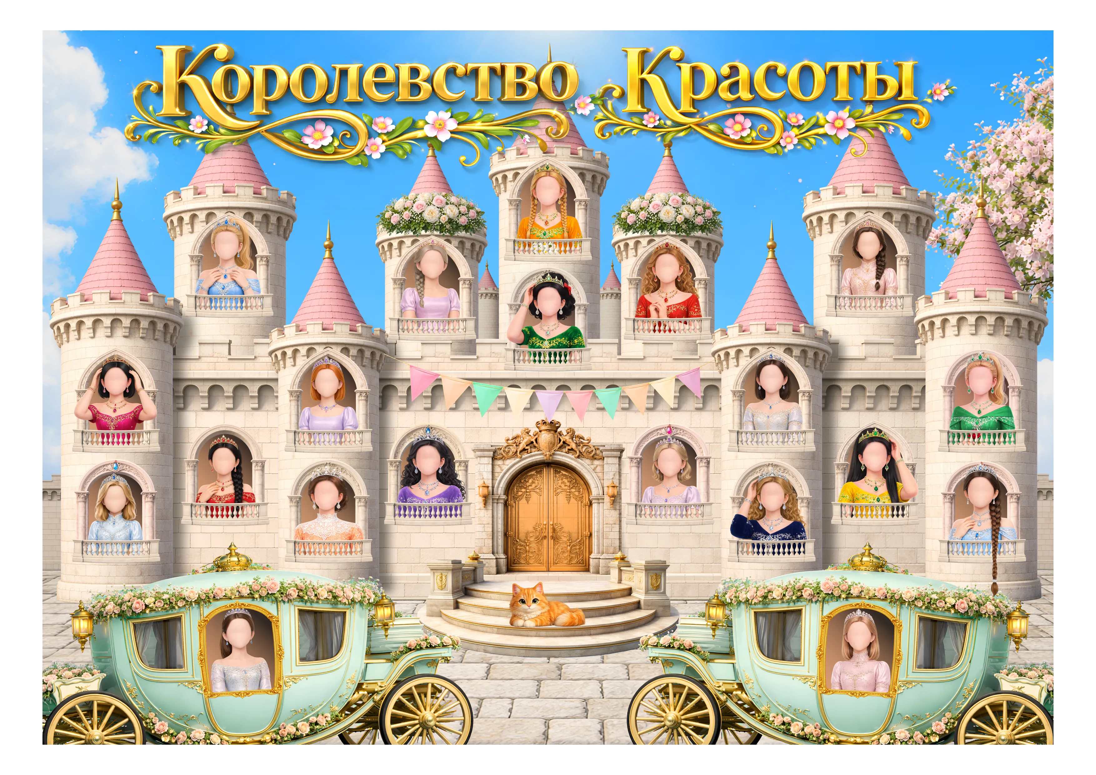 В центре композиции — роскошный дворец с балконами для размещения фотографий девочек. У каждой — своё «окошко» в замке. Нежные кареты, цветы и праздничные детали создают атмосферу волшебства и торжества.