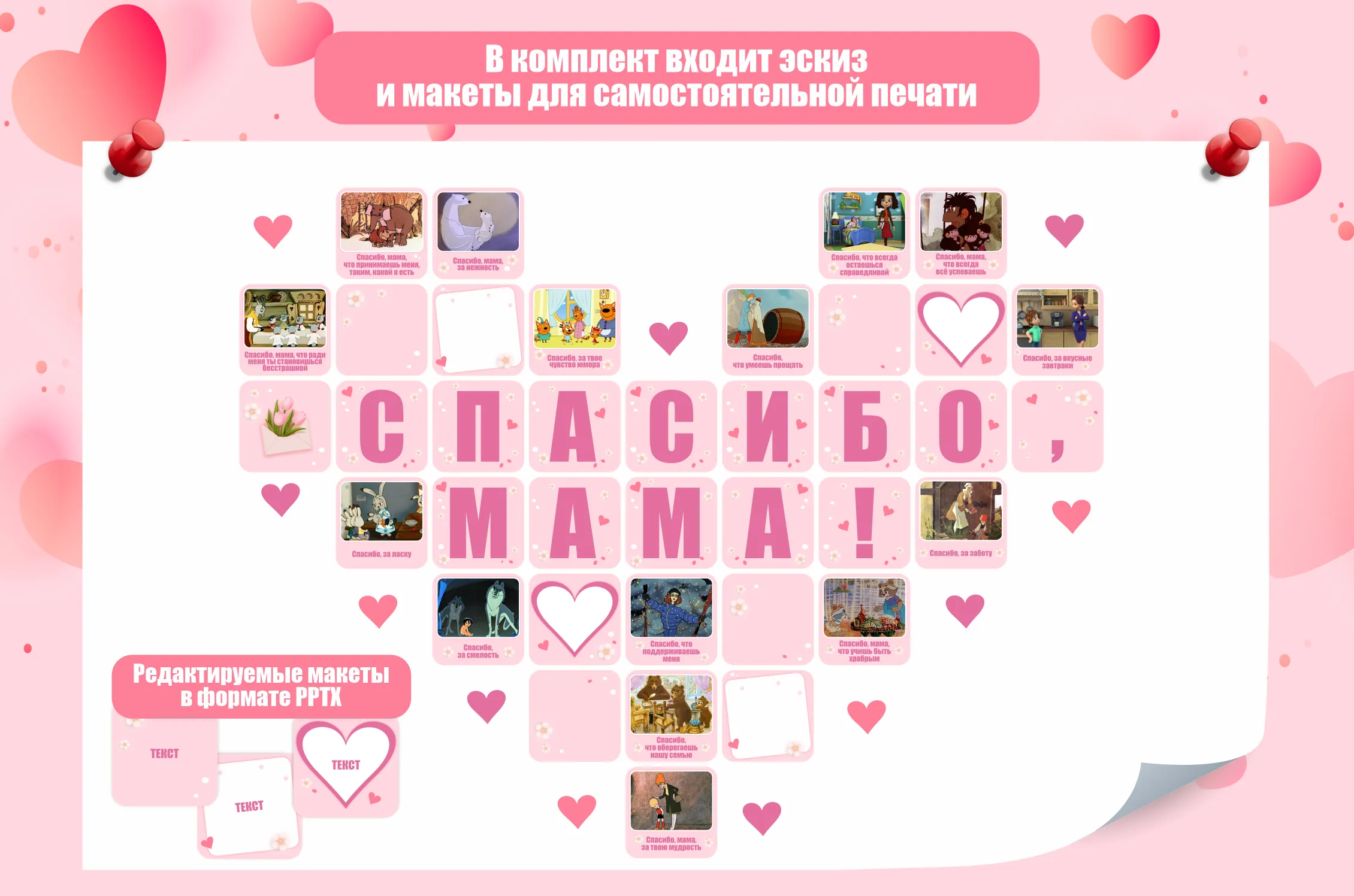 💝 Плакат собирается в форме сердца и наполняется карточками-благодарностями за любовь, заботу и доброту, с иллюстрациями из любимых мультфильмов.