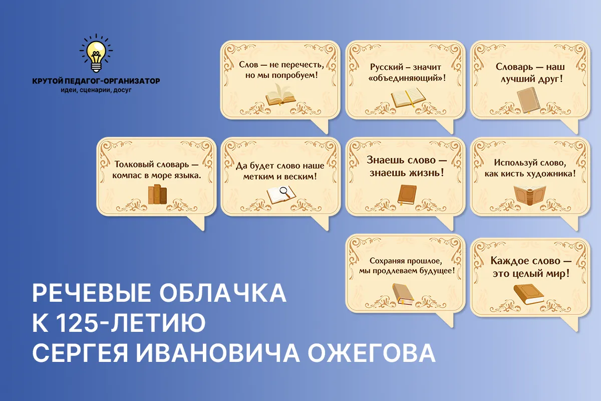 📖 Речевые облачка к 125-летию Сергея Ивановича Ожегова, выдающегося советского лингвиста и составителя знаменитого «Толкового словаря русского языка» — авторская разработка дизайнеров «Крутого педагога-организатора»!
