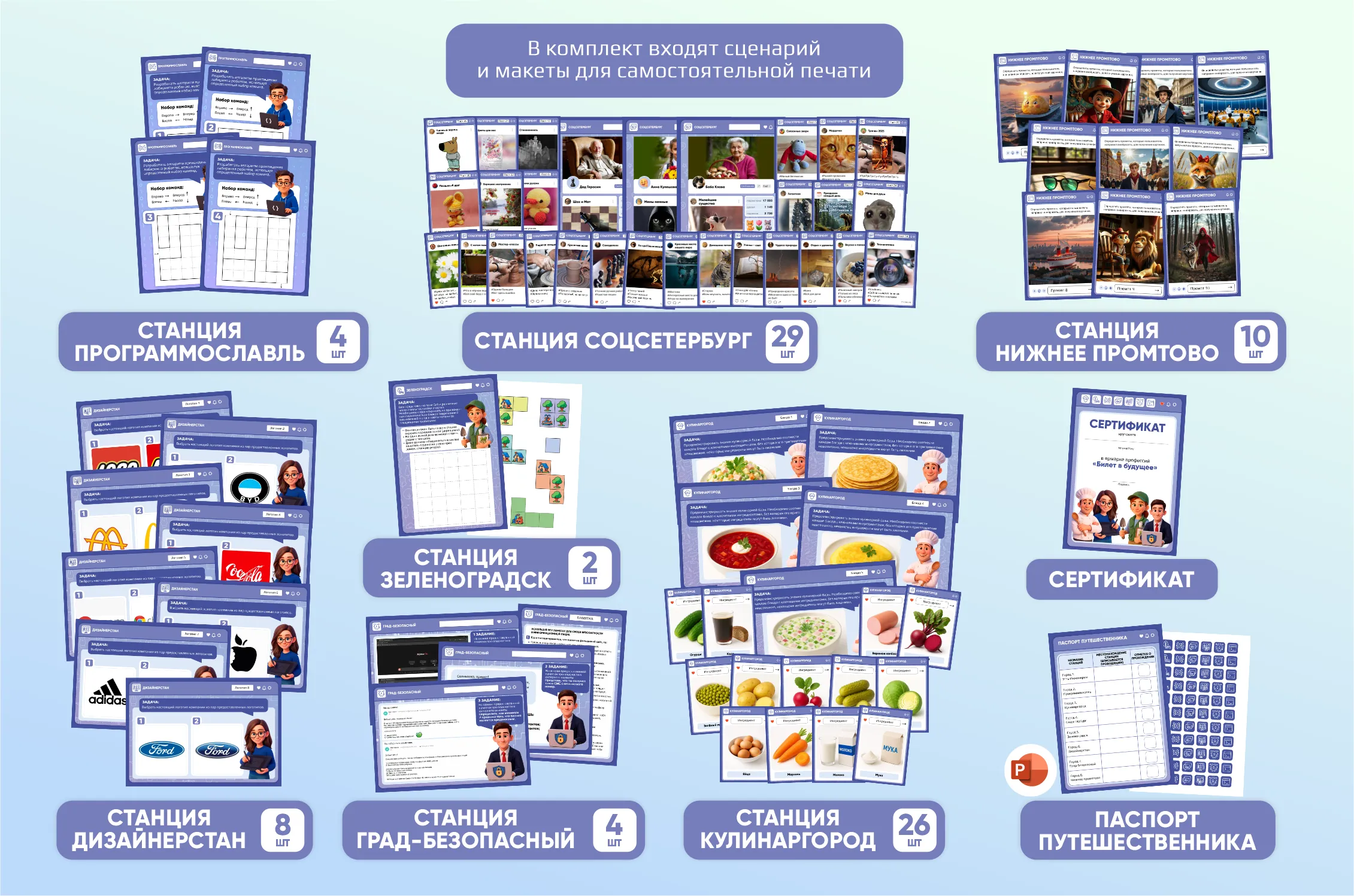 Легенда: Для детей открывается волшебный вокзал, откуда отправляются поезда в удивительные города-профессии. Дети должны заполнить свой индивидуальный/командный паспорт путешественника, выполнив задания в каждом городе и получив соответствующий штамп-отметку.