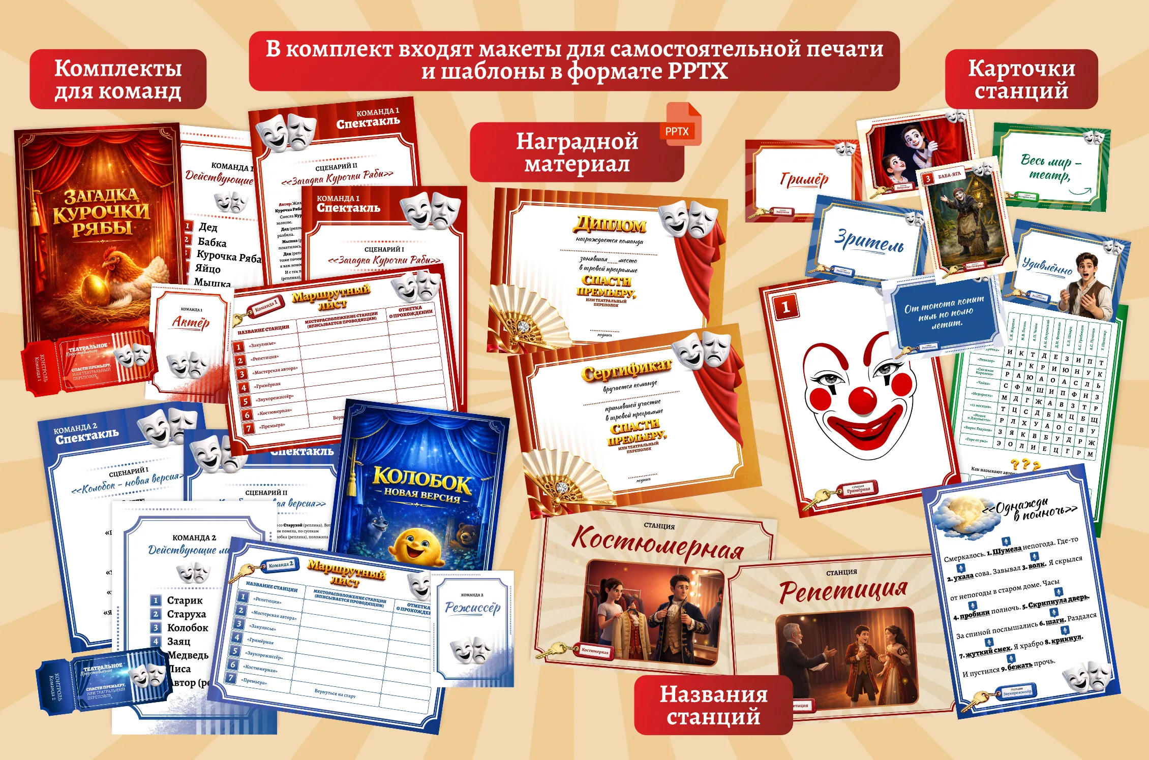 Ассистентка: Каждая команда получает маршрутный лист. Путешествуя по театральным станциям, вы пройдёте испытания и получите то, что ищете. Станции можно проходить в любом порядке, по одной команде на станции. На выполнение каждого задания отводится не больше десяти минут.