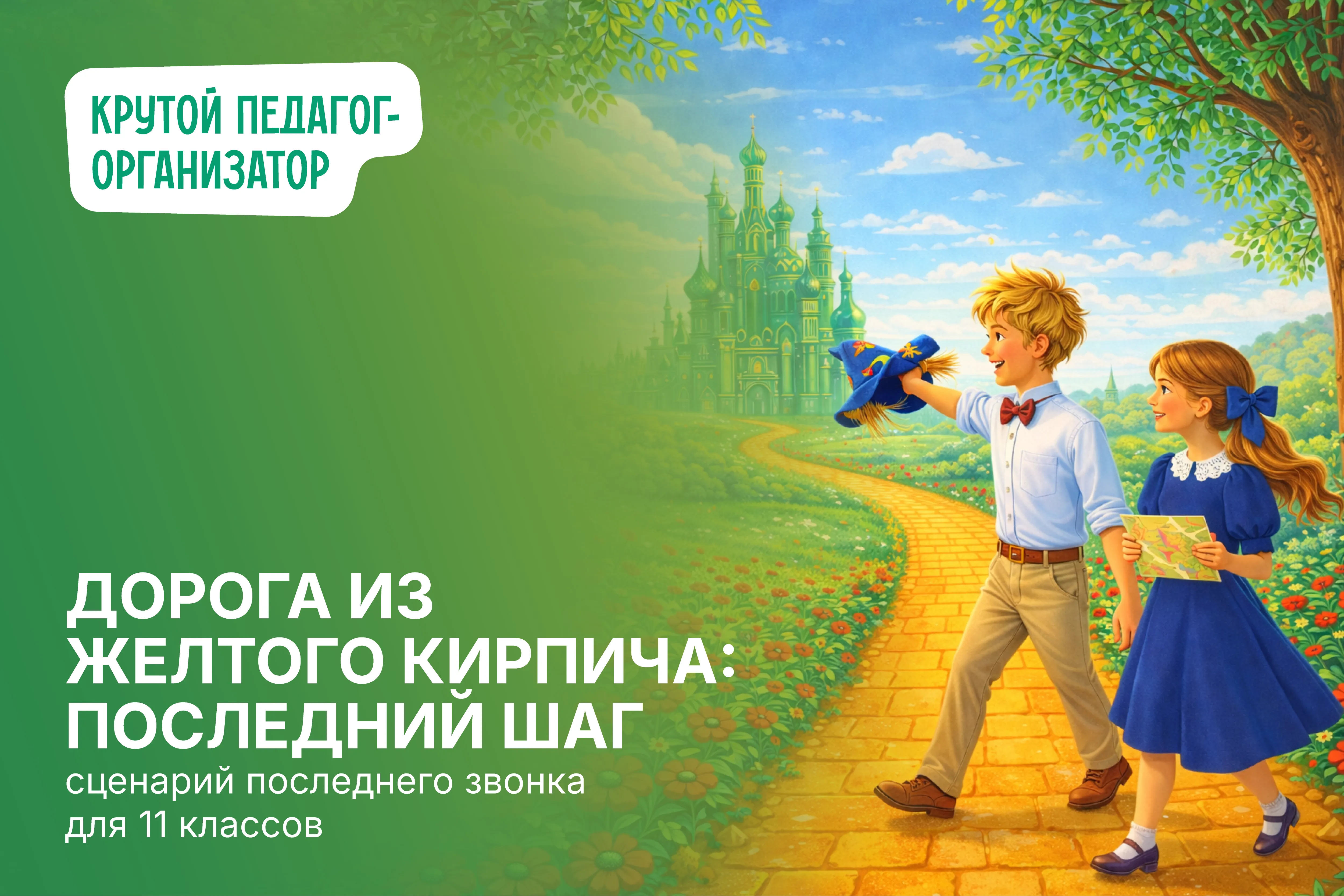 Голос за сценой: Долгой была эта дорога, вымощенная солнечными кирпичиками знаний, смехом перемен и тихими переживаниями перед важными уроками. И вот впереди уже мерцают изумрудные огни! Такие близкие, такие долгожданные…