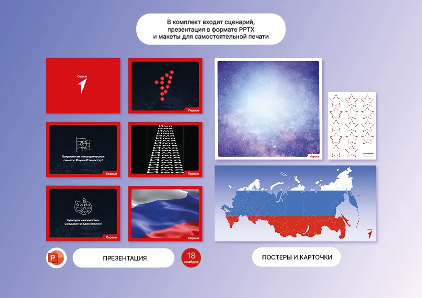 Реквизит: экран с проектором, стикеры в виде звезд, маркеры, плакат с логотипом Движения Первых (в материалах для печати), значки Первых.
