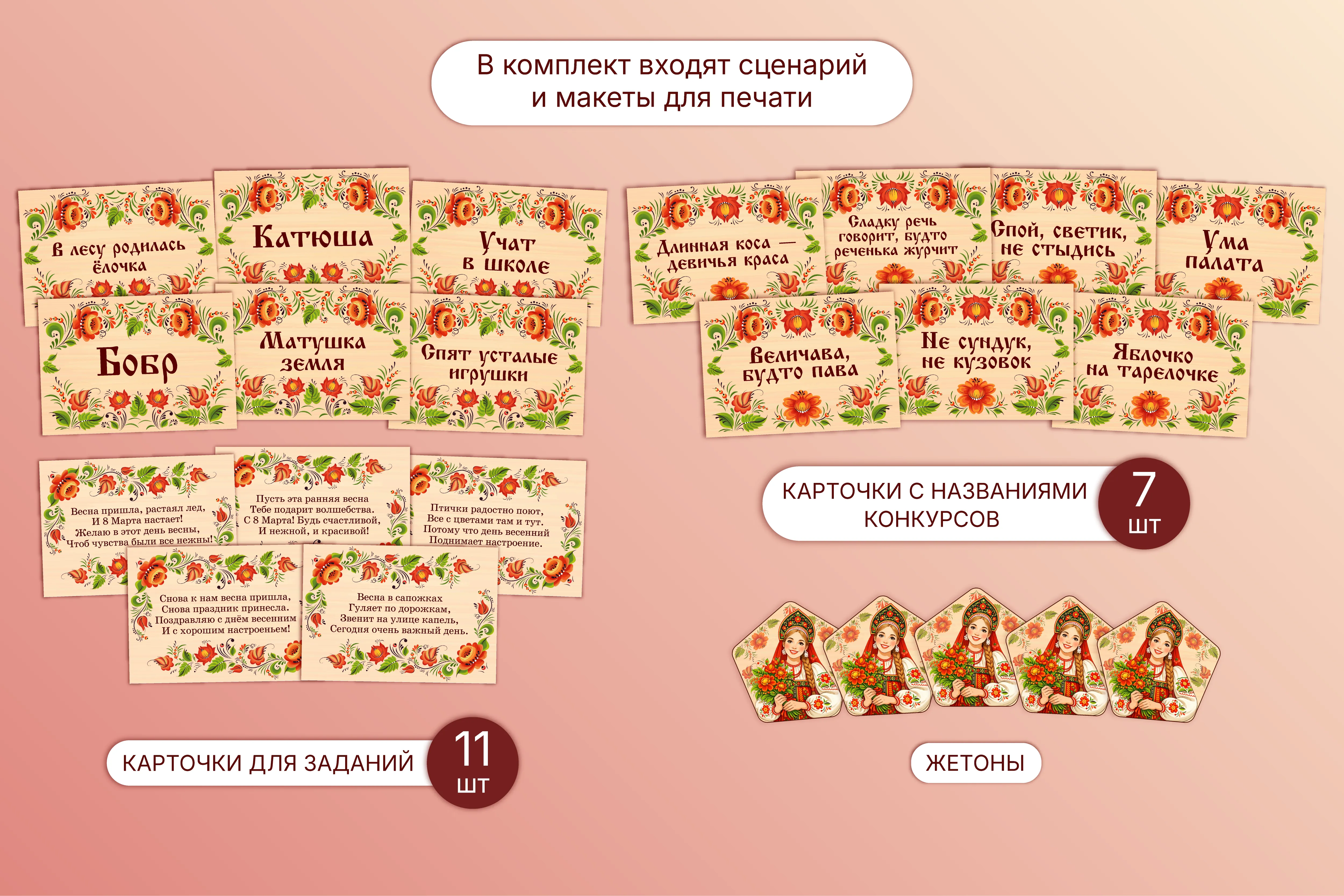 Реквизит: распечатанные и вырезанные жетоны (см. приложение Жетоны), распечатанные карточки (см. приложение Задание), распечатанные записки с названием песни (см. в приложении Песни), распечатанные стихи (см. в приложении Стихи), толстые книги (8-12 штук), разноцветные атласные ленты (12 лент по 1,5м.), скотч, яблоки (4 штуки) и тарелки (4 штуки), непрозрачный мешочек и предметы (расческа, помада, лак для ногтей, зеркальце, карандаш, монеты).