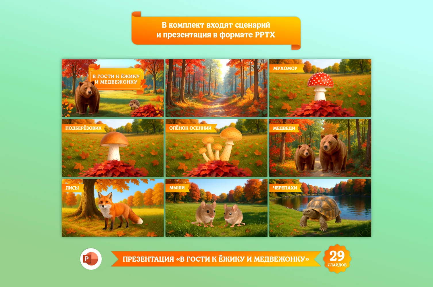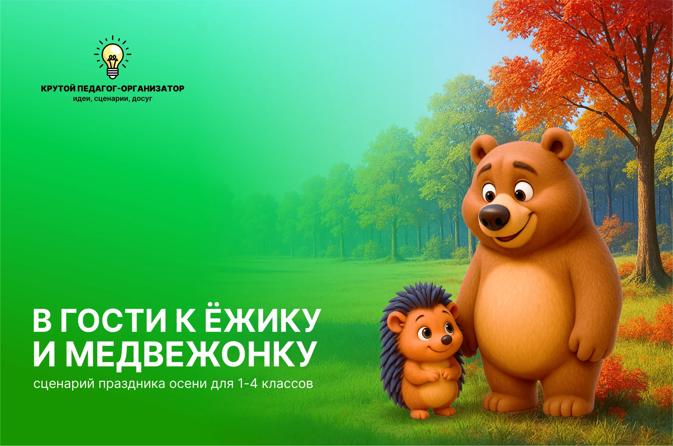 Действующие лица: Осень, Ёжик, Медвежонок, Заяц, Белка, Ветер (голос за кадром)