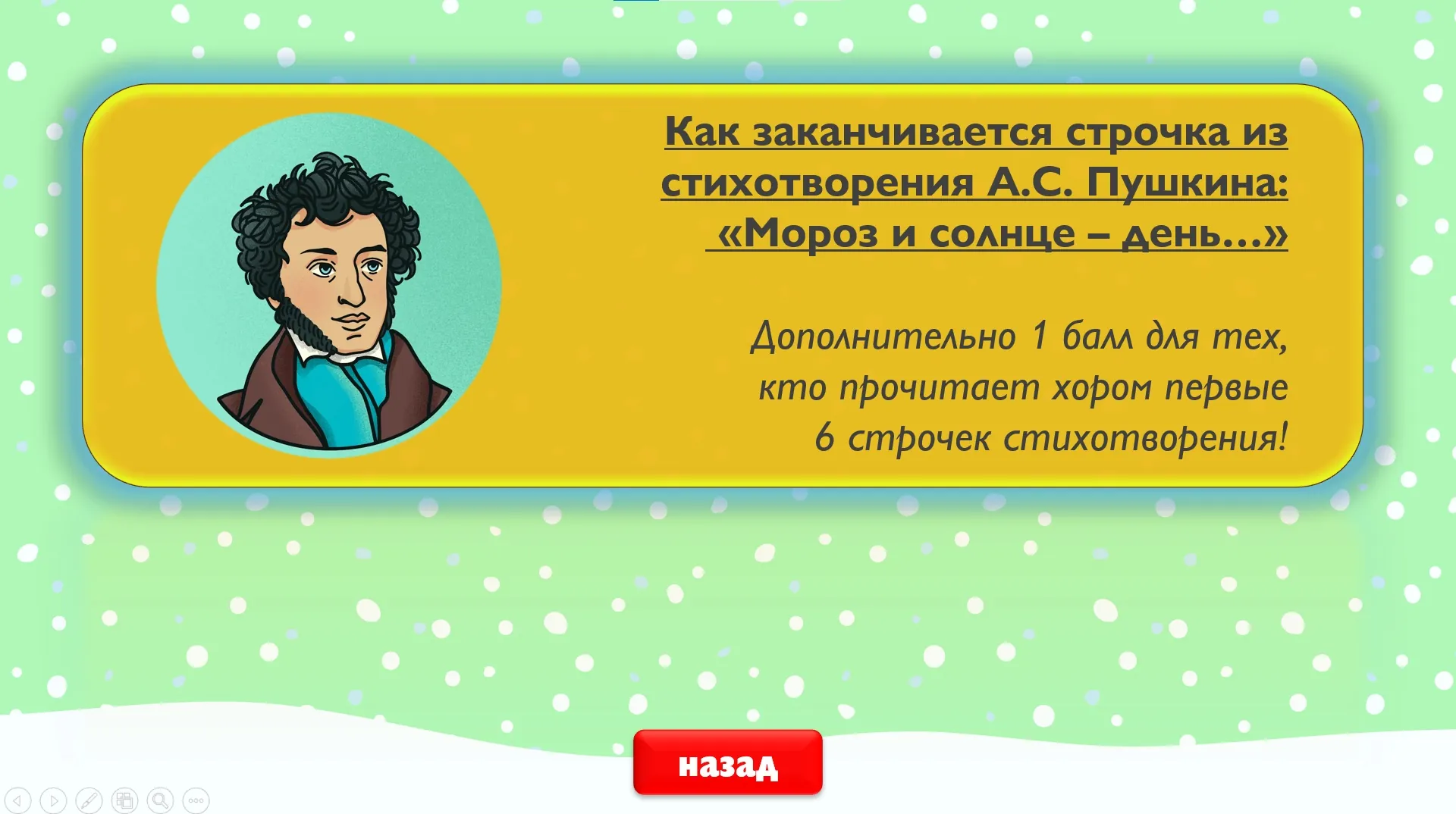 Кабы не было зимы, Александр Пушкин не сочинил бы стихотворения про мороз и солнце, а приключения Дяди Фёдора в Простоквашино не были бы такими чудесными. В этой тематической программе викторина превращается в настоящую зимнюю забаву: участники выбирают шапочку, в которой прячется вопрос или творческое задание. После успешного выполнения в шапку прилетает снежок – так весёлый снеговик отмечает пройденные этапы. Как и в любой лотерее, в нашей программе многое зависит от случая: можно получить бонус от мудрой совы или застрять в сугробе и потерять балл. Участникам стоит положиться на удачу и блеснуть собственными знаниями. А организаторам можно расслабиться, ведь красочная презентация с игрой уже готова.