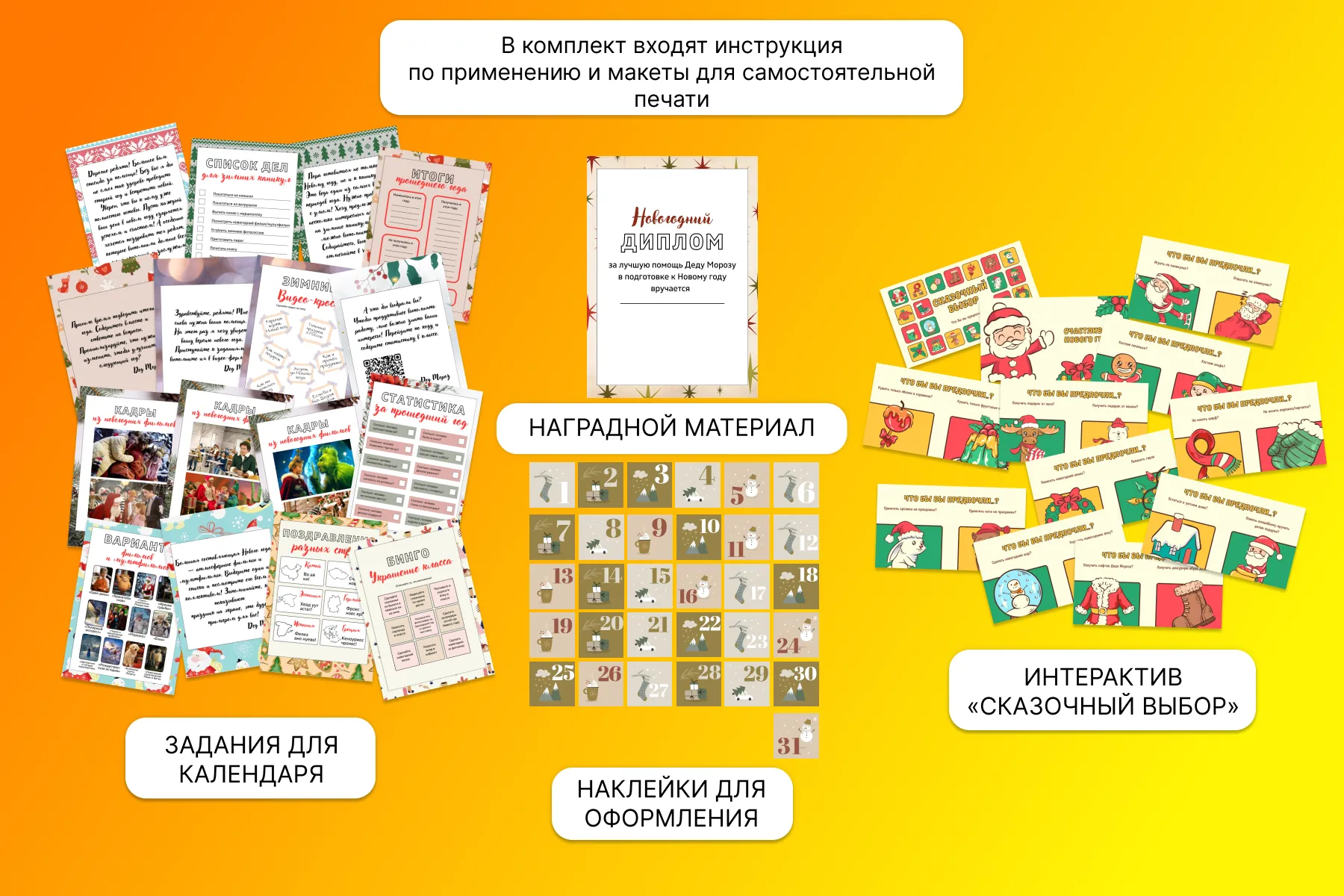 В папке представлен материал двух видов: календарь на всю школу и календарь на класс. И в том, и в другом случае, адвент-календарь рассчитан на месяц (31 день). Педагог сам выбирает, на сколько дней делать календарь, и подстраивает материал под себя. Наполнение также учитывает баланс прикладных, активных, творческих, интеллектуальных и других заданий. У адвент-календаря есть легенда (см. ниже). Задания и подарки составлены максимально универсально, для проведения на любом возрасте детей.