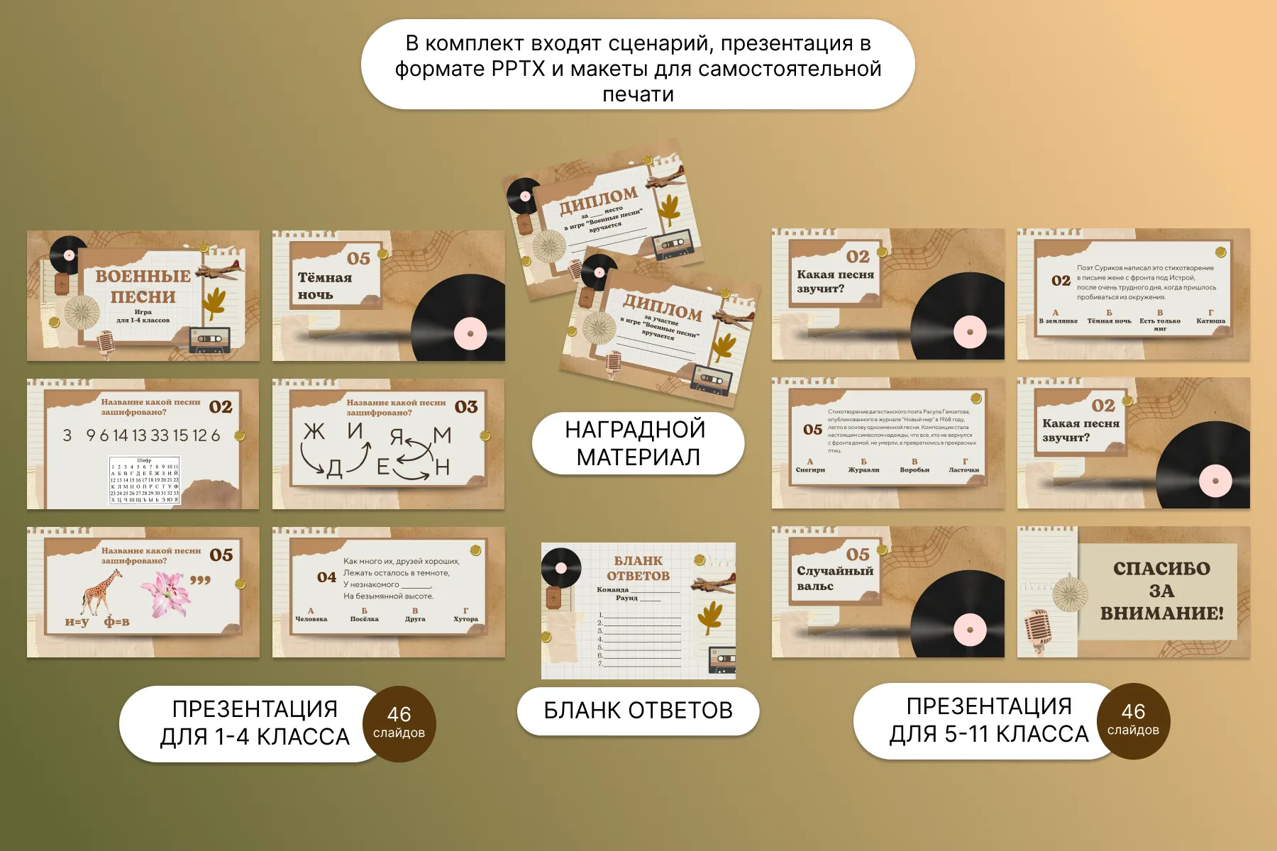 Прилагается инструкция к применению со сценарием, игры в формате презентации pptx и видео, шаблоны для дипломов и бланки ответов. Советуем использовать именно видеоверсию игры.