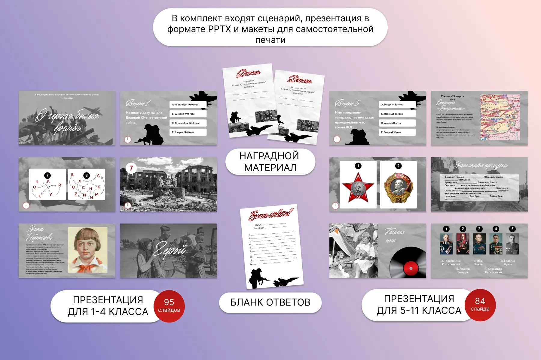 Прилагается презентация pptx и видеоформат, инструкция к применению, отдельные аудио- и видеоматериалы, шаблоны дипломов и бланков для ответов.