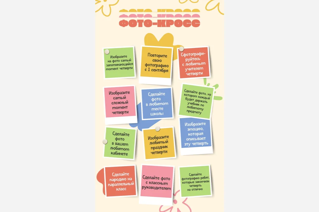 На утренней линейке каждый класс получает задания фото-кросса, которые нужно выполнить в течение дня. Фотографии собираются в одну папку. Далее есть несколько вариантов: