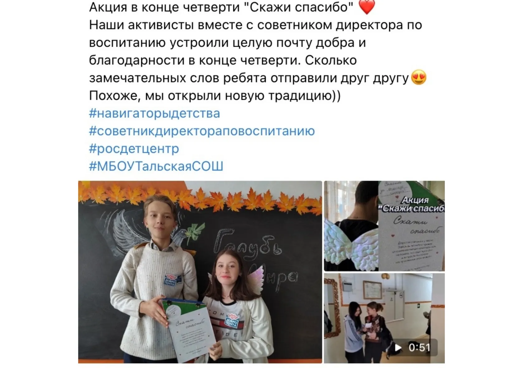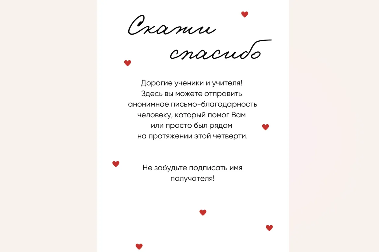 Оформить уголок, в котором ребята могут написать благодарственные записки людям, которые помогли им на протяжении четверти (учителям, одноклассникам и т.д.). Записки складываются в коробку и в конце дня раздаются по классам.