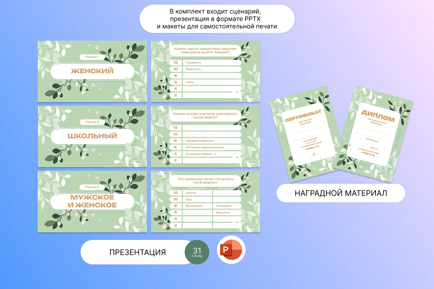 Ведущий 2: Сегодня нам предстоит погрузиться в его атмосферу. В нашей игре 5 раундов: “Женский”, “Детский”, “Школьный”, “Педагогический”, “Мужское-женское”.