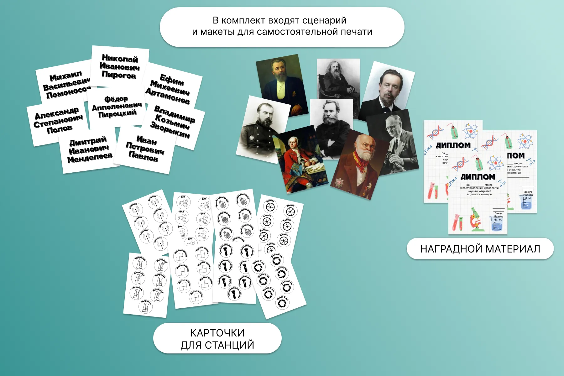 Каждому великому открытию предшествует история, которую так важно беречь и передавать следующим поколениям. Коварные злодеи создали машину времени и хотят присвоить изобретения русских учёных себе. Исправить ситуацию могут лишь внимательные школьники. В этой программе они станут спецагентами, вернутся в прошлое, познакомятся с учёными и их открытиями, соберут все изобретения вместе и внесут в общую летопись. В квесте участвует 8 команд старшеклассников. Им нужно найти восемь персонажей-учёных от Михаила Ломоносова до Владимира Зворыкина, выполнить интеллектуальные и творческие задания, чтобы получить нужные предметы и информацию для хроники. К подробному сценарию прилагается музыкальный материал для аудио-задания, вся необходимая распечатка (имена и портреты учёных, изобретения, реквизит для этапов) и дипломы победителей.