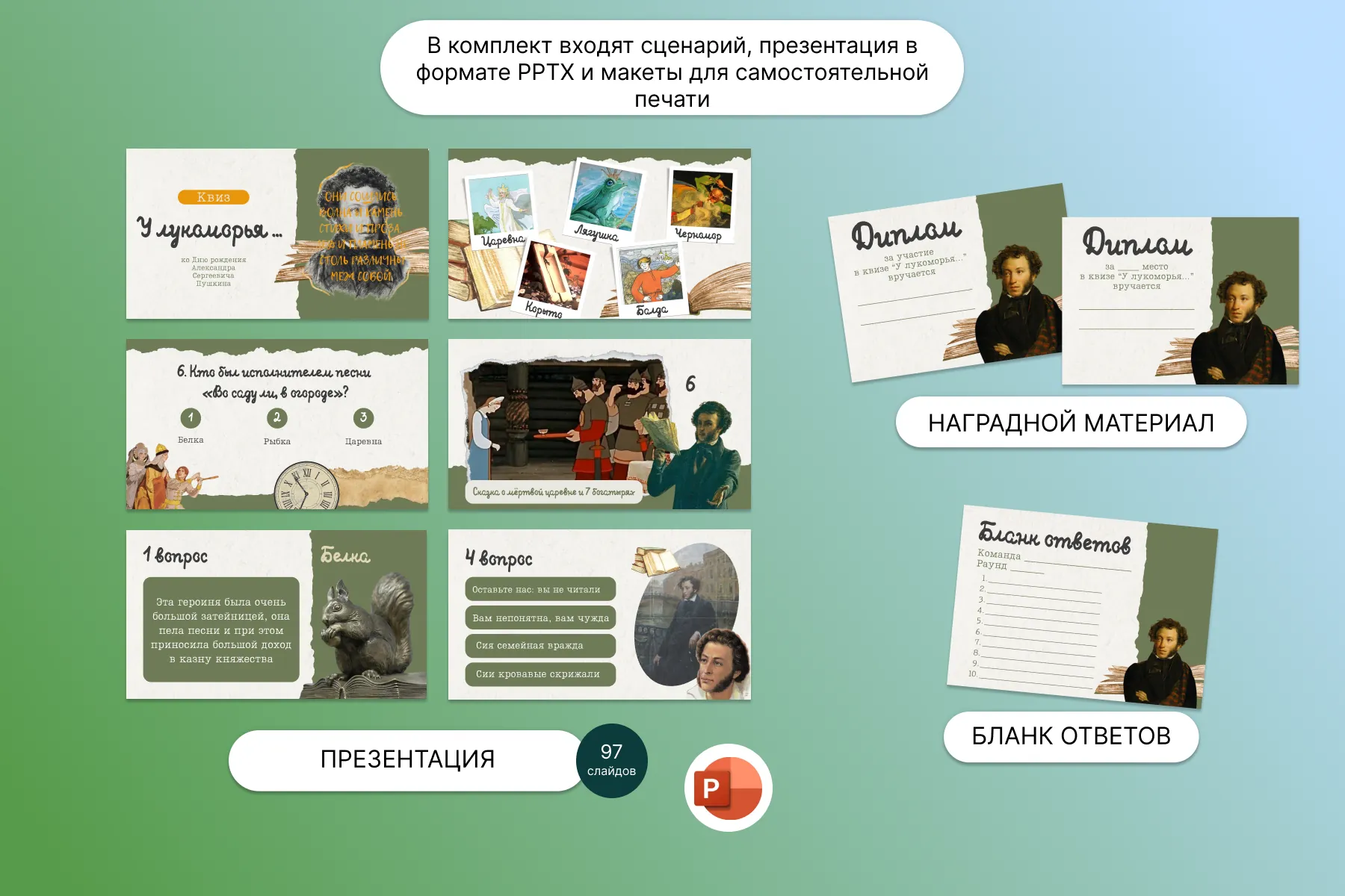 Прилагается квиз в 3 форматах (pptx, pdf и видео), инструкция к применению, шаблоны для дипломов и бланки ответов.