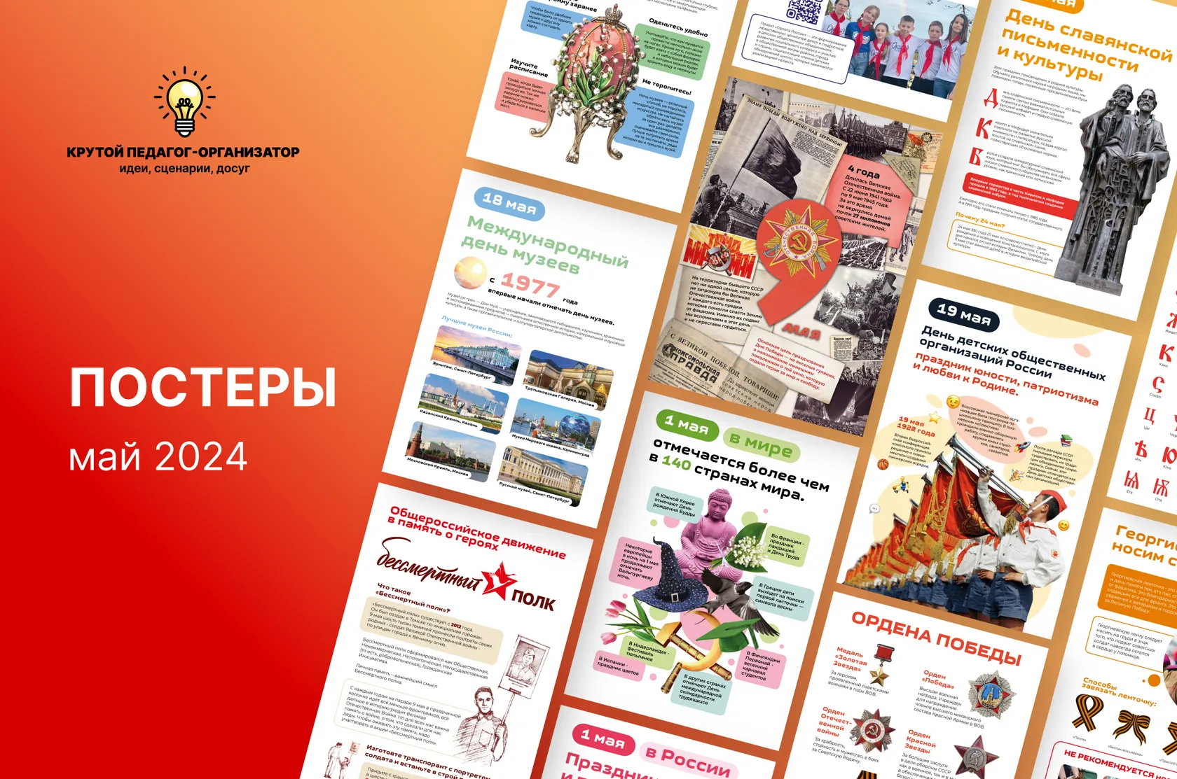 Май - по-настоящему богатый на важные события праздник! А особенно на памятные даты. В наборе растяжка «Май» и постеры, посвящённые Дню весны и труда, Дню Победы, Международному дню музеев, Дню детских общественных организаций в России, Дню славянской письменности и культуры и Дню пограничника.