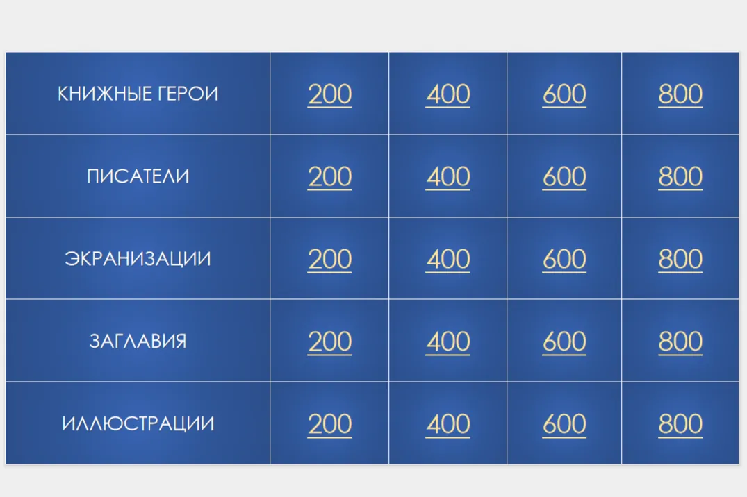 Любое внешкольное мероприятие должно оставаться в памяти школьников праздником радостного общения. Увлекательно проведенная Неделя детской книги может стать неделей открытия новых имен, новых героев, возможно и незаслуженно забытых книг, их авторов. Завершением ее может стать викторина, которая поможет старшеклассникам вспомнить героев, писателей, экранизации книг. Игра с необходимыми аудио- и видеофайлами прилагается.