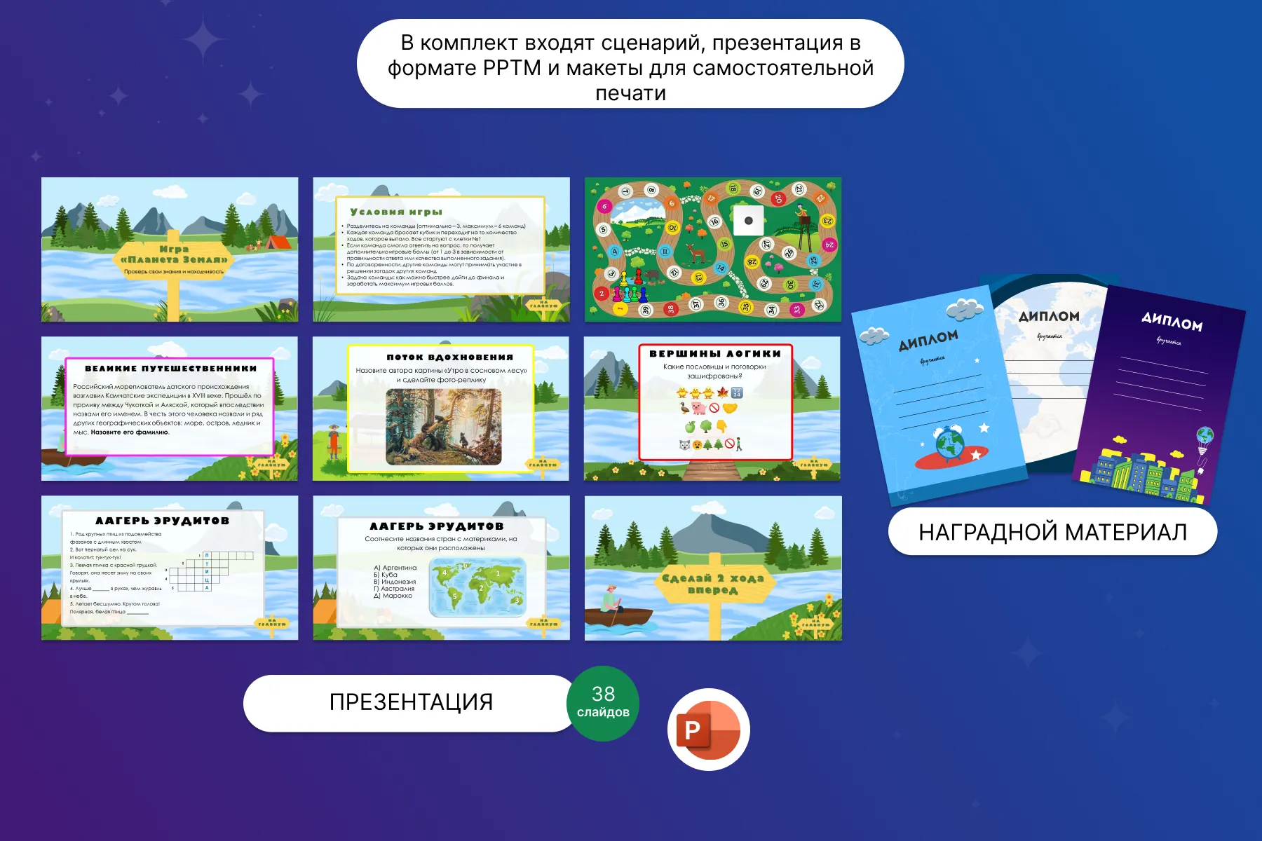 Отправиться в кругосветное путешествие мечтают многие, а кое-кому из наших предшественников и современников это уже удалось. Пора любознательным школьникам тоже взглянуть на планету Земля с разных сторон и проделать свой великий путь. Маршрут будет насыщенным, поэтому ребятам понадобятся знания, наблюдательность, фантазия и немного удачи. Программа проходит в формате настольный игры, которая транслируется на экране. Командам нужно бросать кубик, передвигаться по полю и решать выпавшую задачу. В процессе игры ребята взойдут на вершину логики, разгадывая ребусы, и разобьют лагерь эрудитов, отвечая на вопросы о строении Земли, природных явлениях и обитателях. А ещё поймают поток вдохновения в творческих заданиях, вспомнят великих открывателей и увидят кадры известных мультфильмов. Дипломы, видеофайлы, инструкция и варианты проведения игры прилагаются к основной презентации.